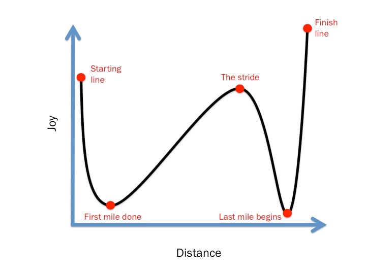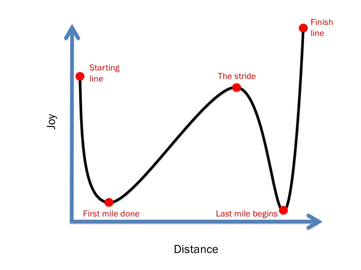 So when it comes to long runs, I think you can plot the relationship between distance covered and your level of joy as follows: