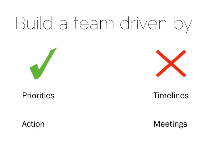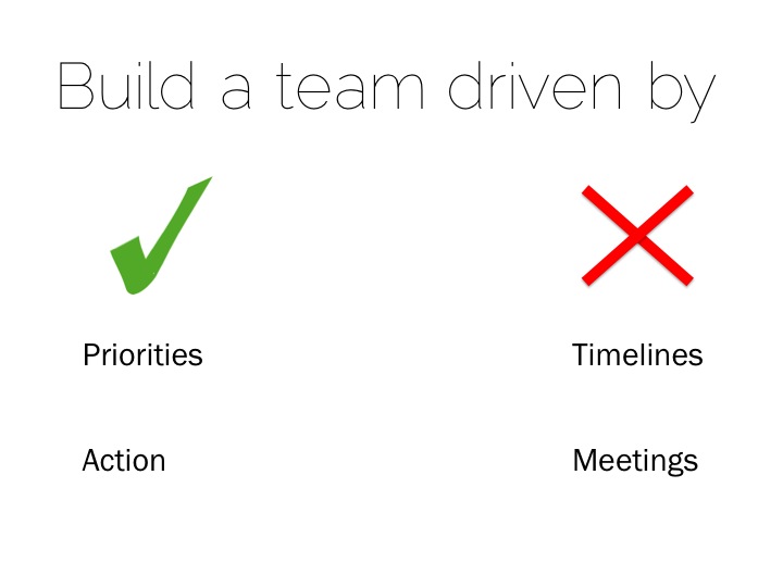 - Build a team driven by priorities, not timelines. Know what are the most important things to work on, work on those first, and move on to the next thing. Have goals (that can include timelines), but realize that things can change. Trust your team that they will work towards those goals, and then knock off the priorities one by one. Of course there will be deadlines driven by external pressures, but keep those at a high level so that the team has a clear goal to focus on. This will ensure better quality (because you’re not cutting corners and rushing to get things done) and higher velocity (because everyone is focused on doing the right things in the right order).