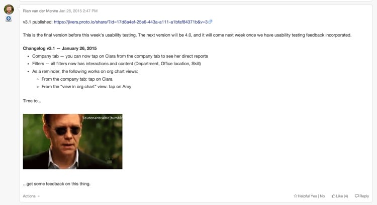 Every couple of days I would publish a new version of the prototype based on team feedback, along with a list of what changed: