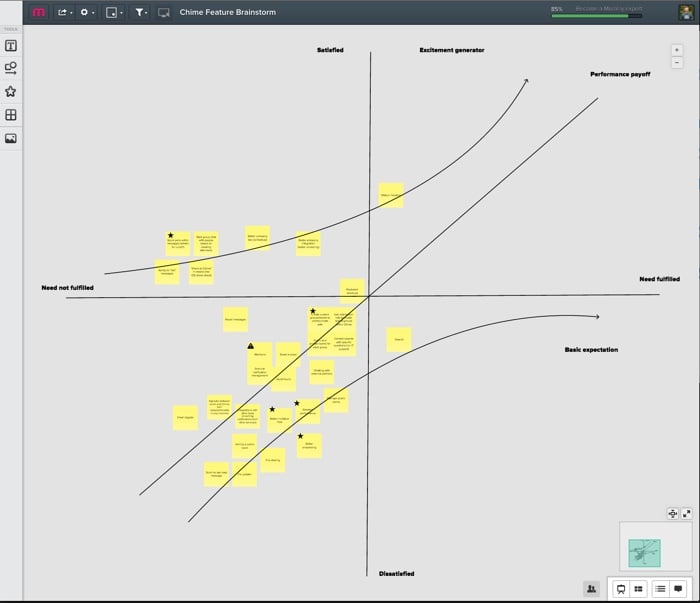 So, as we started our prioritization exercise, I drew the x and y axes on a new mural. We then listed out all the features that we’re thinking about for the next few months—one feature per sticky note. We proceeded to go through each sticky note, and discuss where it fits on the Kano model—how far are we in meeting the need currently, and how satisfied do we believe users will be once we’ve met the need better?